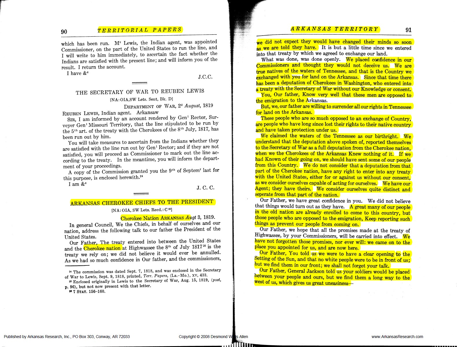Arkansas Cherokee (Chickamauga - Lower Towns) Chiefs To The President From Arkansas Territroial Papers